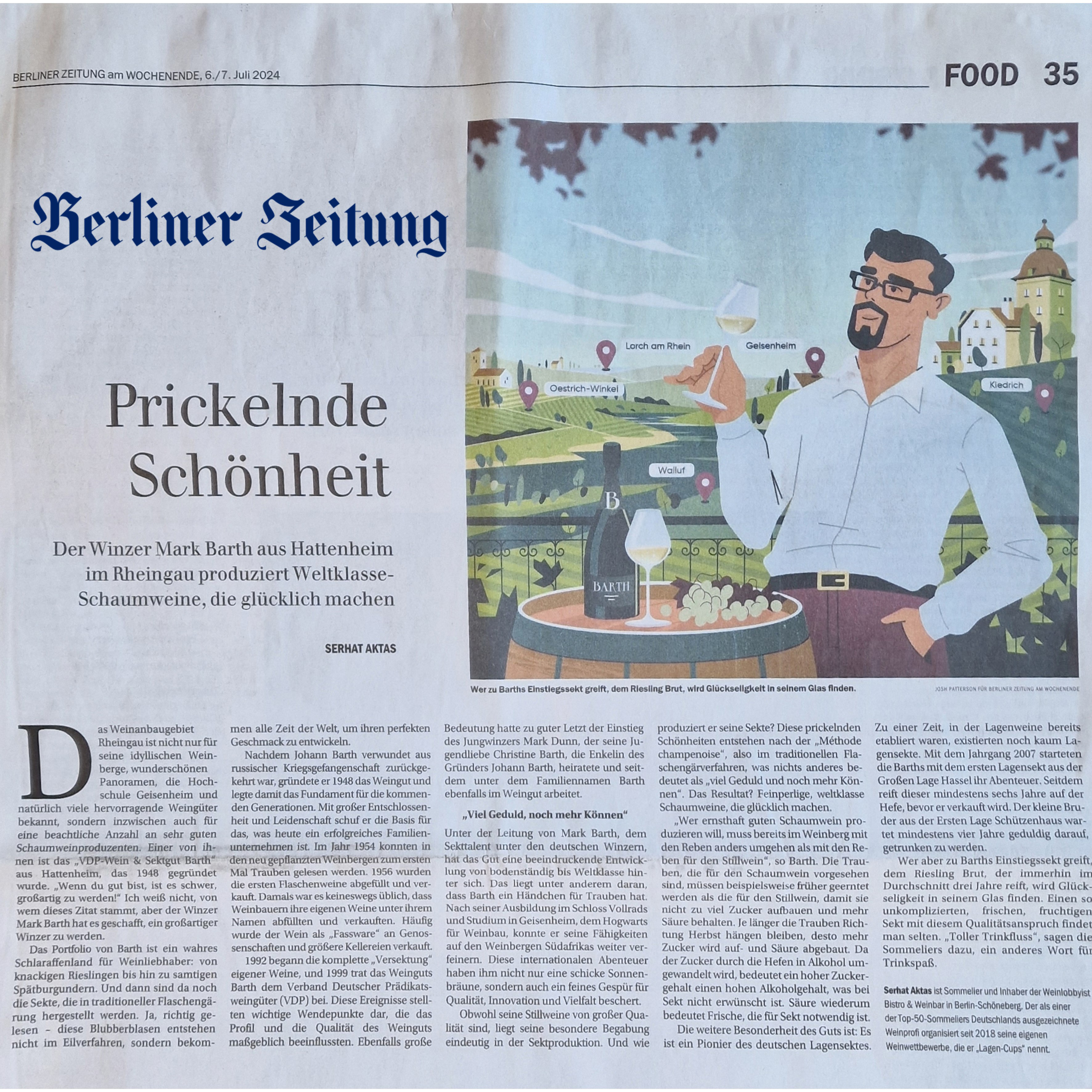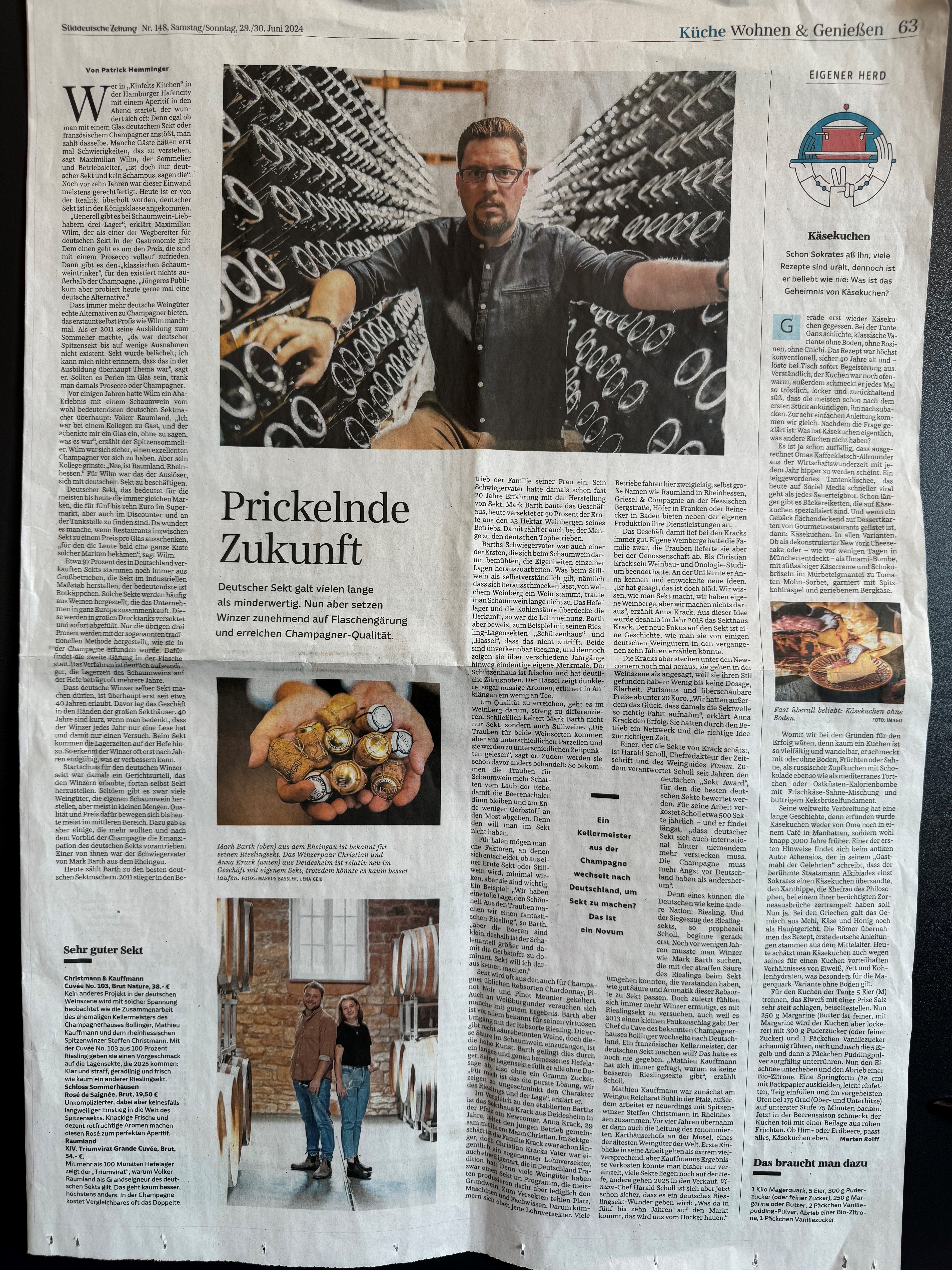 von Patrick Hemminger: "Barth aber ist vor allem bekannt für seinen virtuosen Umgang mit der Rebsorte Riesling. Die ergibt recht säurebetonte Weine , doch diese Säure im Schaumwein einzufangen, ist die hohe Kunst. Barth gelingt dies durch ein langes und genau bemessenes Hefelager. Seine Lagensekte füllt er alle ohne Dosage ab. "Für mich ist das die purste Lösung, wir zeigen so ungeschminkt den Charakter des Rieslings und der Lage" erklärt Mark."